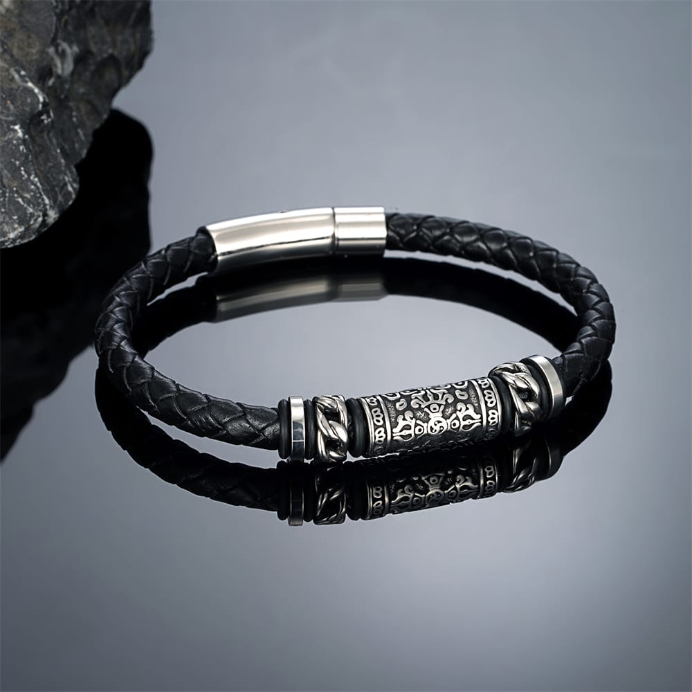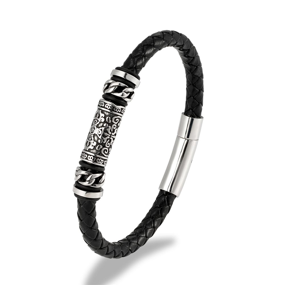 Pulsera de cuero genuino trenzado y acero inoxidable con cierre magnético.