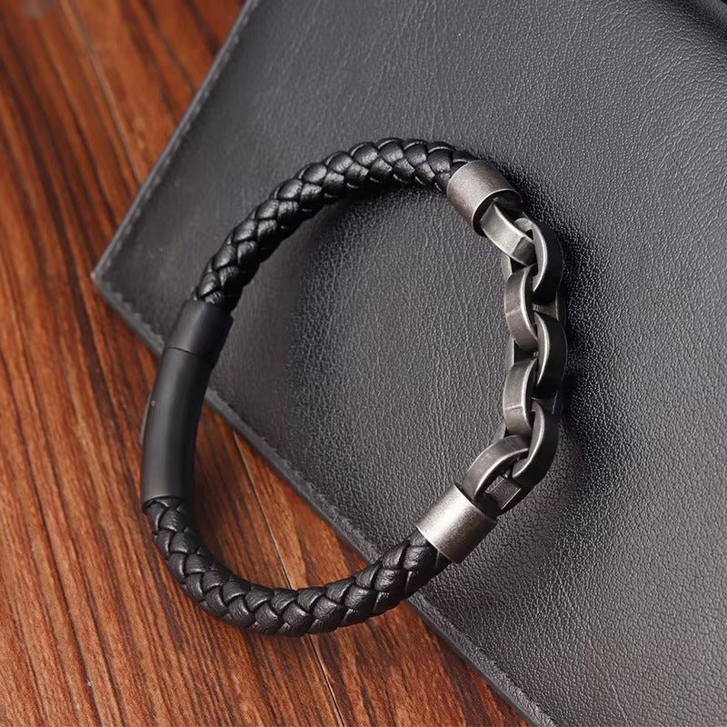 Pulsera de cuero genuino trenzado y acero inoxidable con cierre magnético.