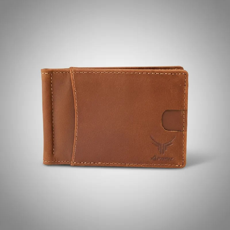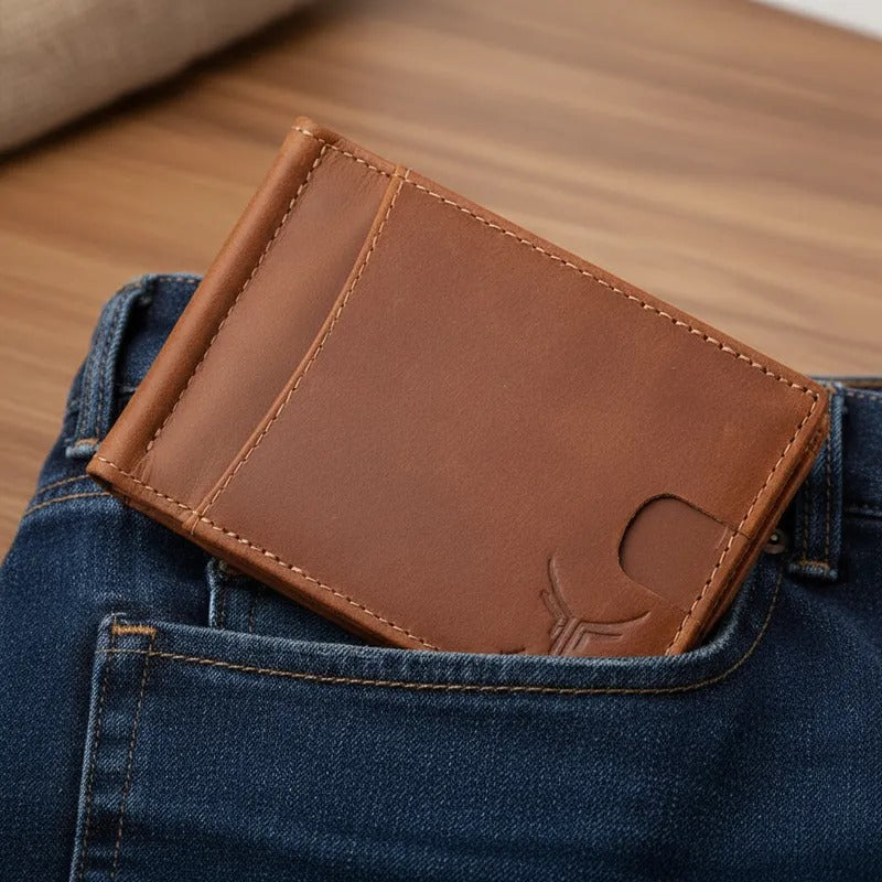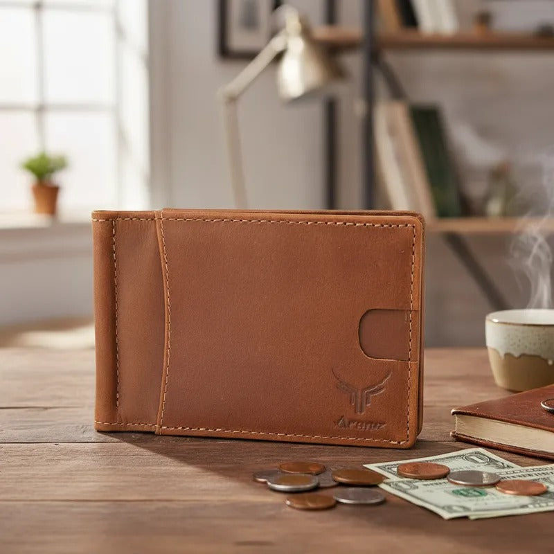 Tarjetero moderno y elegante con clip de metal para llevar billetes o documentos.